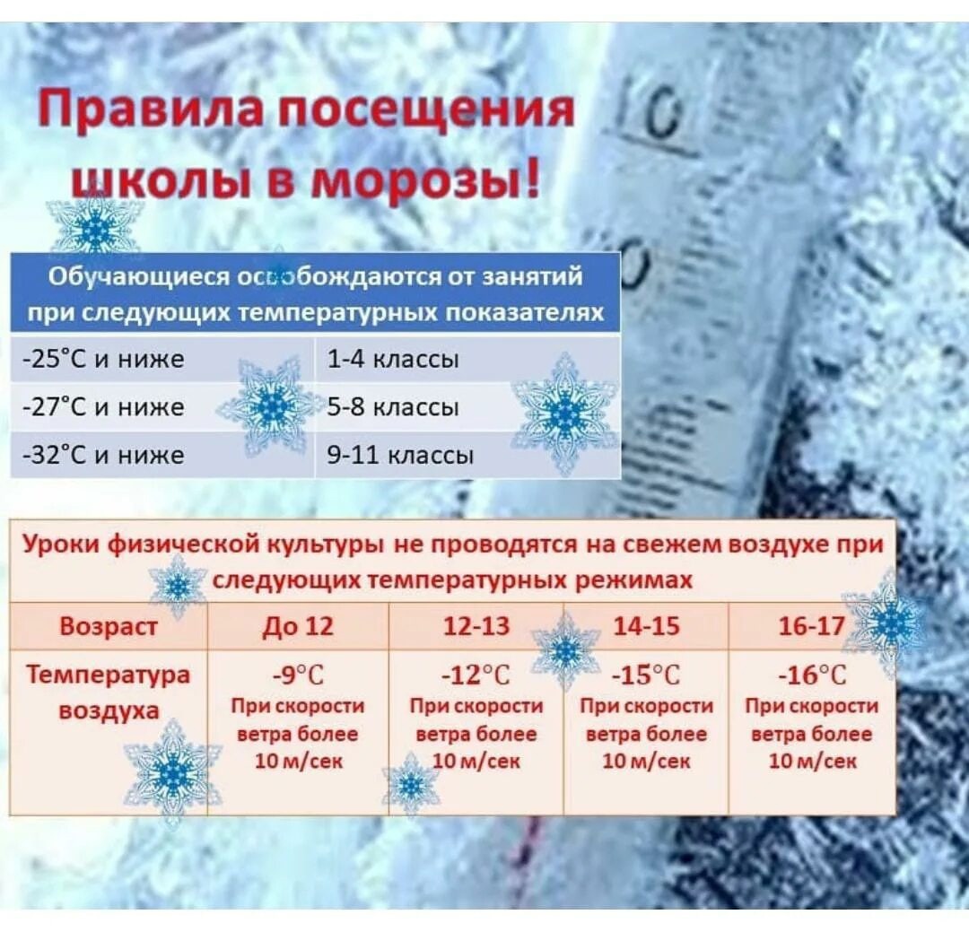 Для учеников, которые всё же придут на занятия, необходимо соблюдать меры безопасности — носить тёплую многослойную одежду и защищать лицо и руки от обморожения.